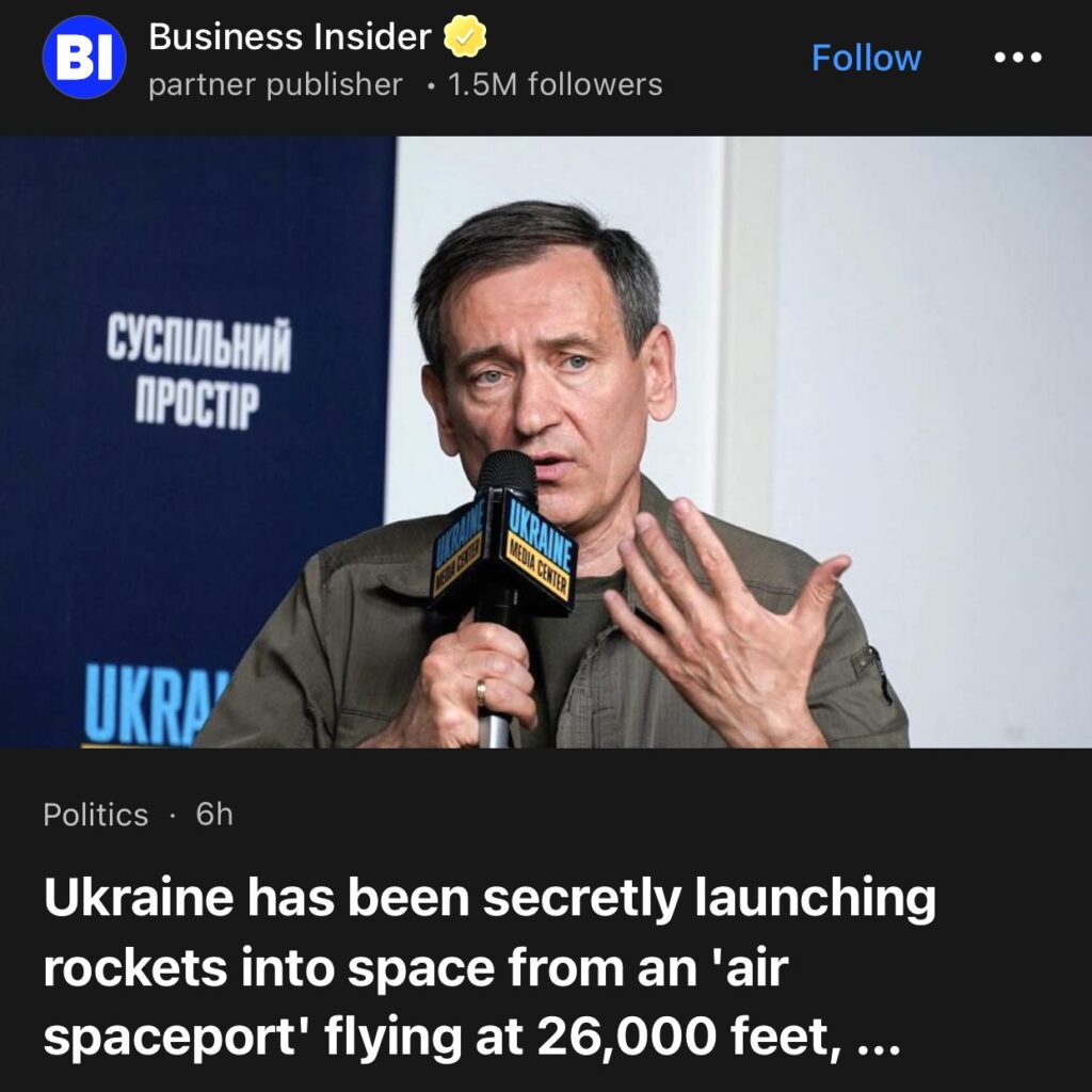 5。据Business Insider 周二报道,一位议员透露,乌克兰一直在从一处位于26,000英尺高空的“空中太空港”秘密向太空发射火箭。