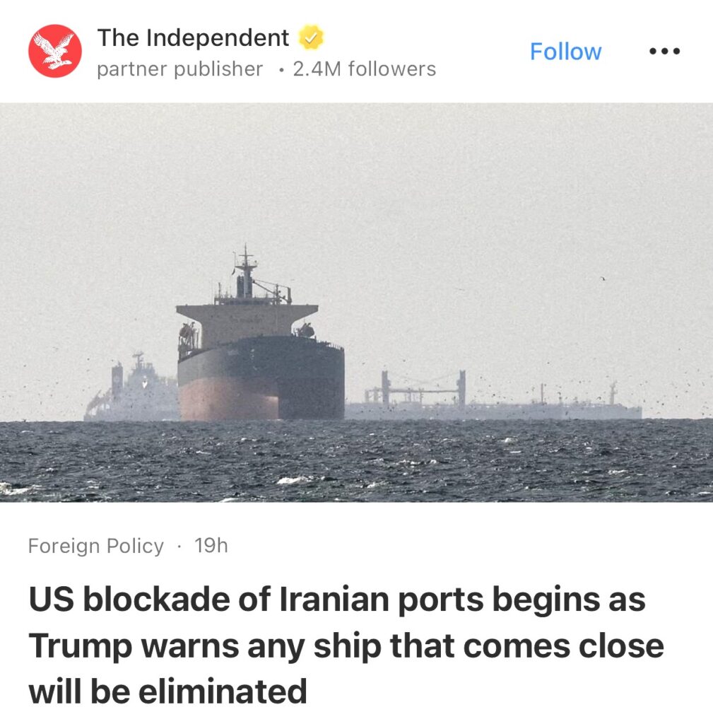 15。据The Independent 周一报道,美国对伊朗港口的封锁正式启动,特朗普警告称,任何试图靠近的船只都将被摧毁。