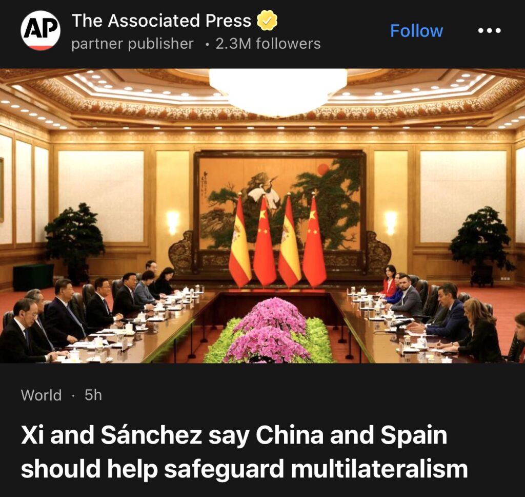 7。北京(美联社)—— 周二,中国与西班牙两国领导人在北京举行会晤,双方承诺将加强双边关系,并致力于维护多边主义;当前,世界正受到各类冲突(包括近期伊朗局势引发的战事)的冲击。
