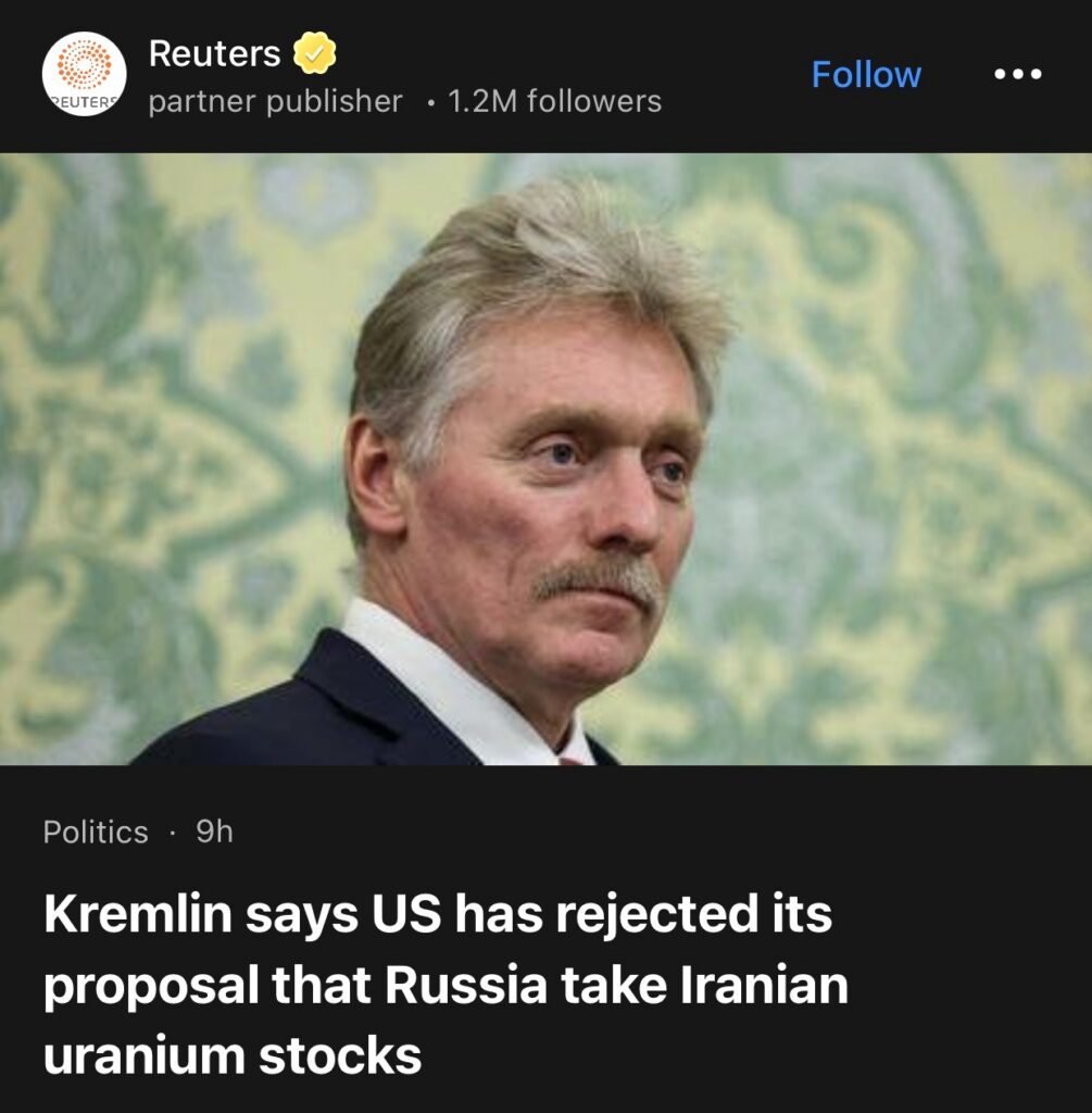 6。4月15日(路透社)——据援引克里姆林宫发言人周三的表态称,美国已拒绝了俄方提出的一项提议,即由俄罗斯将伊朗境内的所有浓缩铀运出该国,以此作为协助解决中东冲突的一种途径。