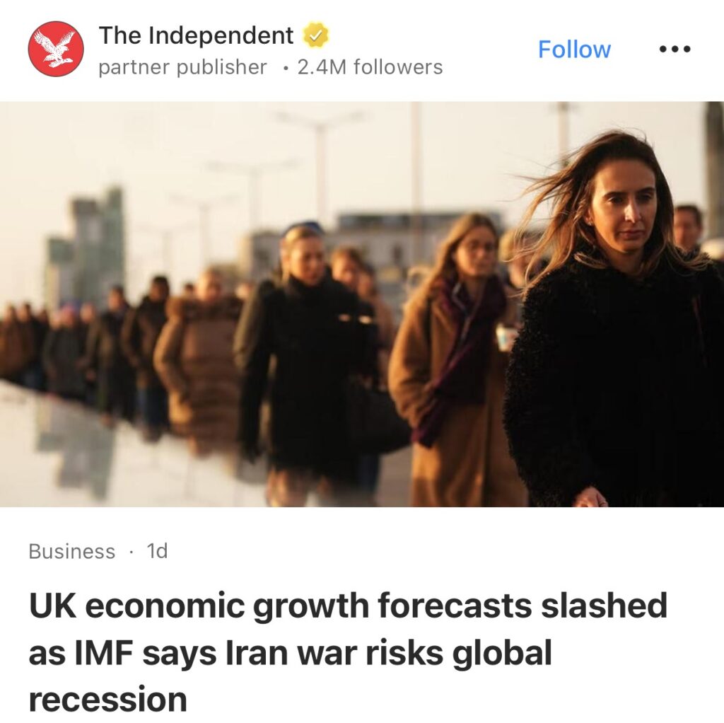 14。据The Independent报道,英国经济增长预期遭大幅下调,IMF称伊朗战争恐引发全球衰退。