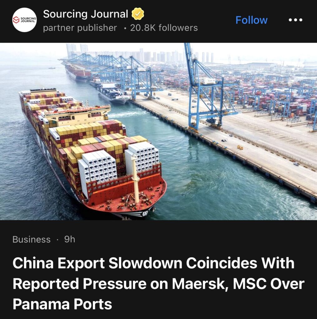 2。据Sourcing Journal 周四报道,马士基与地中海航运因巴拿马港口问题面临压力,中国出口放缓。