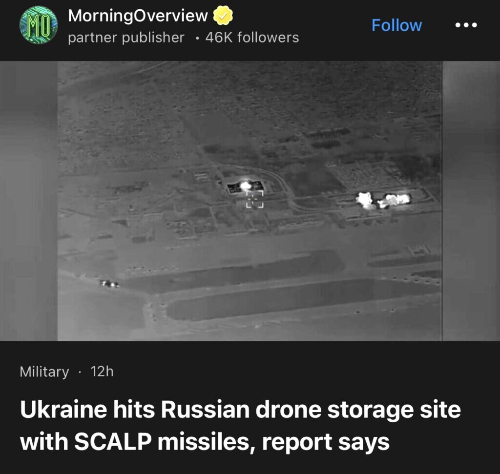 3。据MorningOverview周三报道,乌克兰使用“斯卡普”导弹打击了俄罗斯无人机储存点。