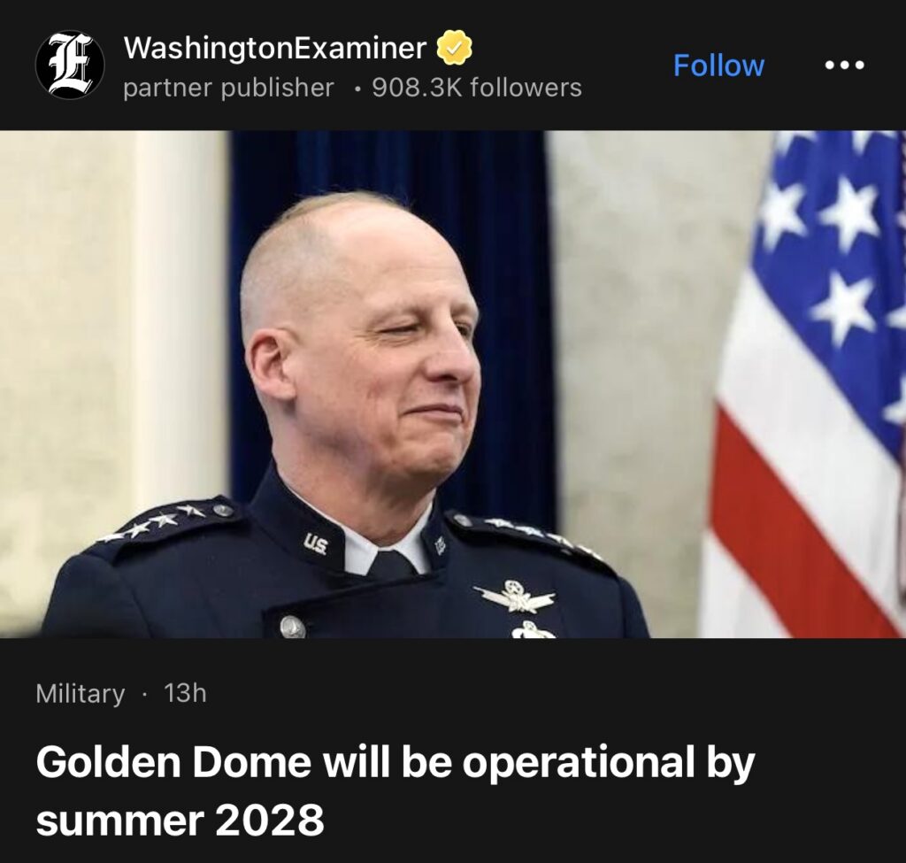 12。据WashingtonExaminer 周三报道 ”金顶”将于2028年夏季投入运营。负责该项目的将军周三表示,美国军方的“金穹顶”(Golden Dome)分层防空系统将于2028年夏季投入运行。