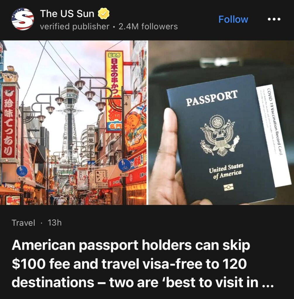 9。据The US Sun报道,美国护照持有者可免除 100 美元费用,免签证前往 120 个目的地,其中两个是“全球最佳旅游目的地”。日本和泰国是美国游客可以免签证游览的两个国家,它们被《国家地理》评为全球 25 个最值得旅游的地方之一。
