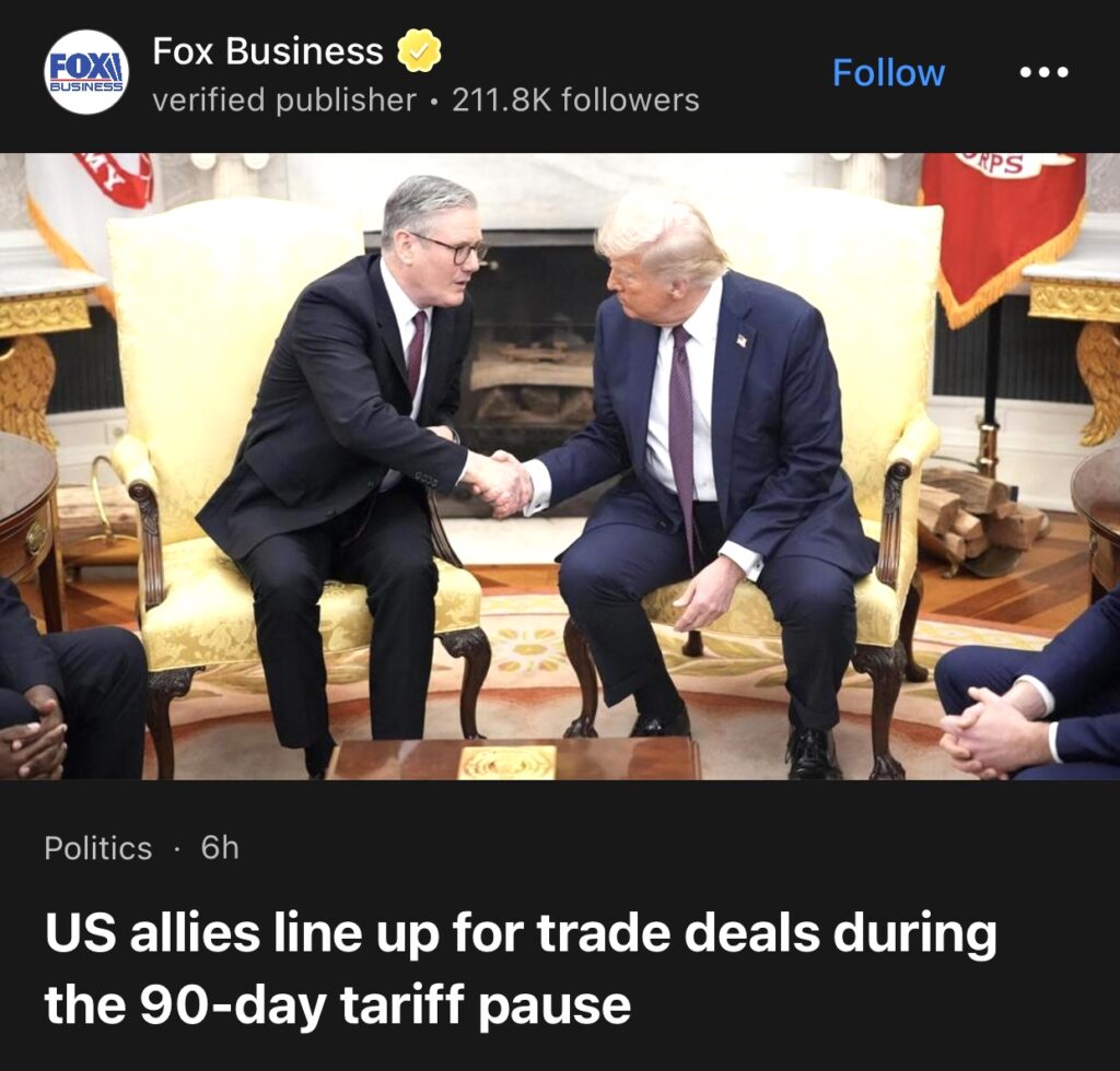 10。据Fox Business报道,美国盟友在90天关税暂停期间,正排队与美国达成贸易协议。