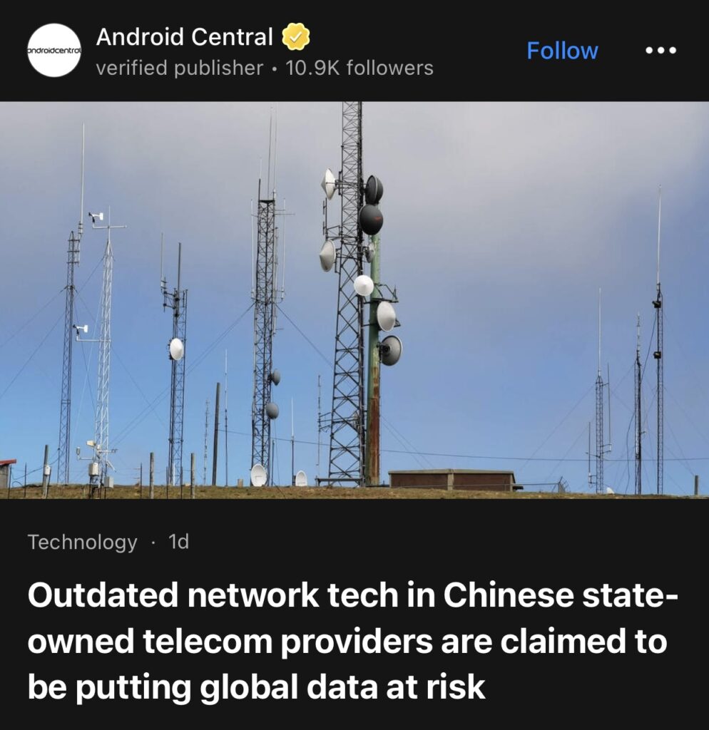 6。据Android Central报道,中国国有电信运营商过时的网络技术正在危及全球数据安全。移动威胁缓解公司 iVerify 的一份新报告声称,一些最主要的移动流量互联服务提供商所使用的老旧且未加密的网络协议,正让黑客组织得以窃取跨国移动数据,甚至可能窃取你的数据。