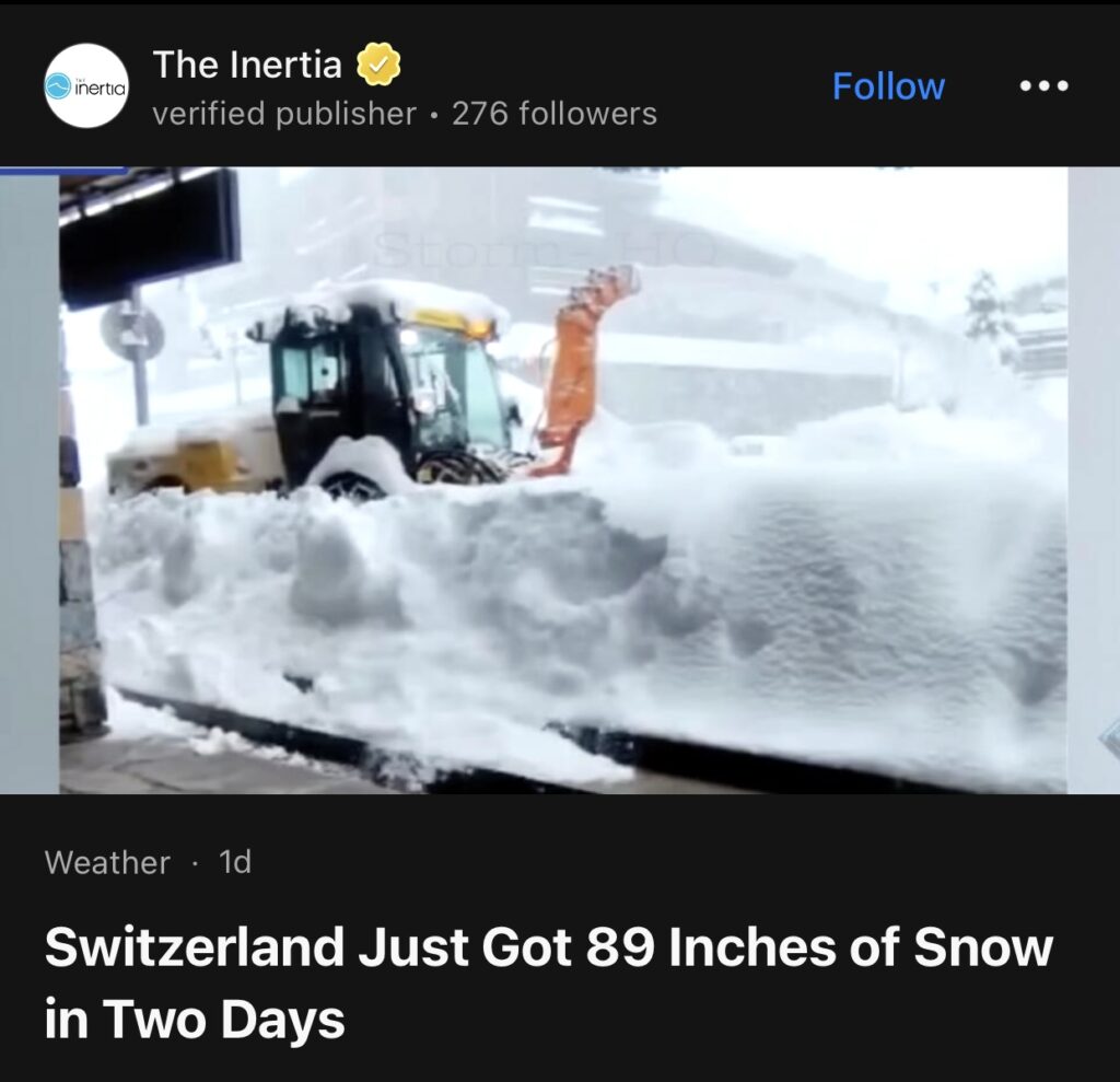 5。据The Inertia报道,本周,瑞士经历了史上最大降雪,两天和三天的降雪量均创下新高。据“雪脑”(Snowbrains)网站称,辛普朗地区仅两天就达到了89英寸(约239厘米),三天就达到了97英寸(约247厘米)——这两个纪录分别保持了26年(1999年为85英寸)和35年(1990年为90英寸)。
