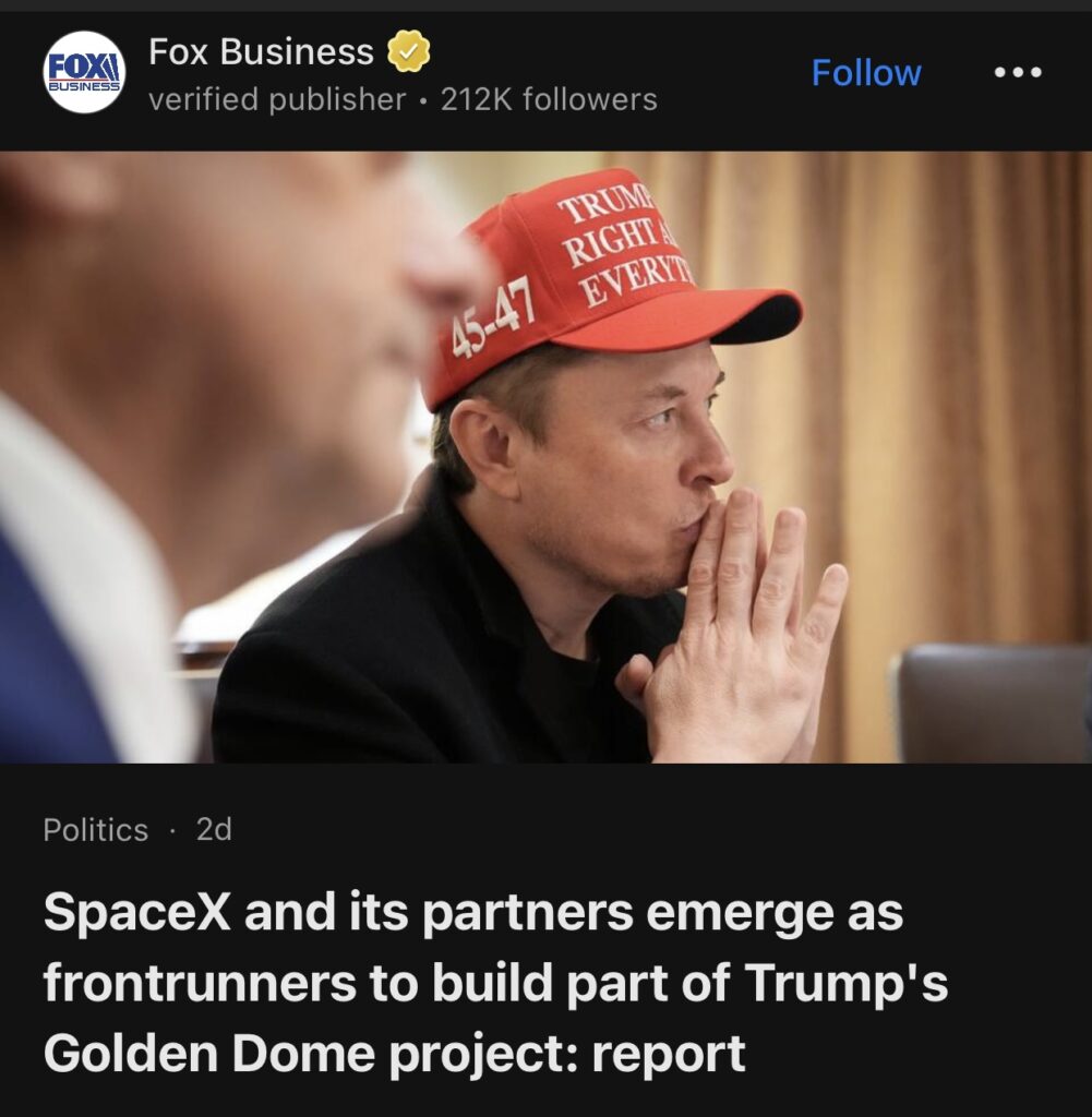 10。报道称,SpaceX及其合作伙伴成为特朗普“金色穹顶”项目建设的领跑者。