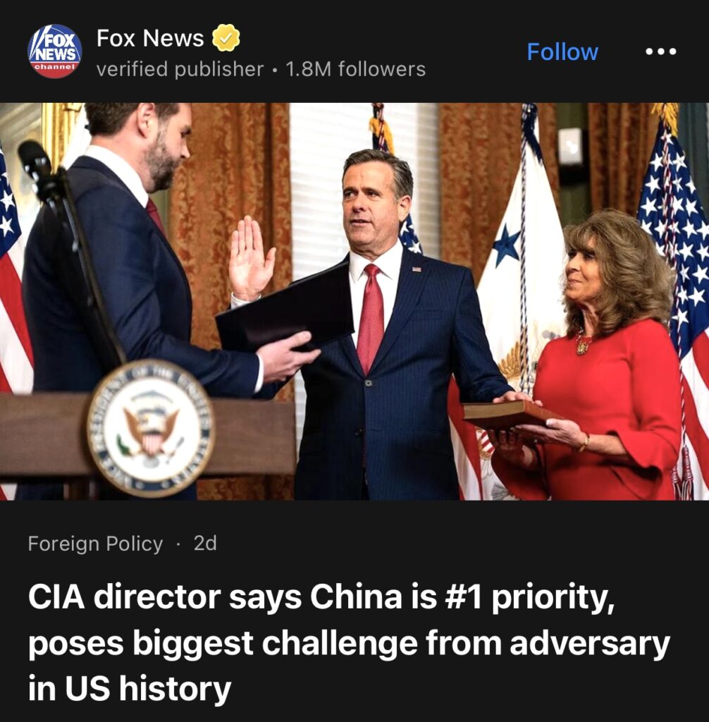 11。据Fox News报道,中情局局长称,中国是美国历史上最大的挑战对手。