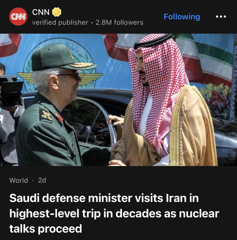 7。据CNN报道,沙特国防部长访问伊朗,开启数十年来最高级别访问,核谈判持续推进。
