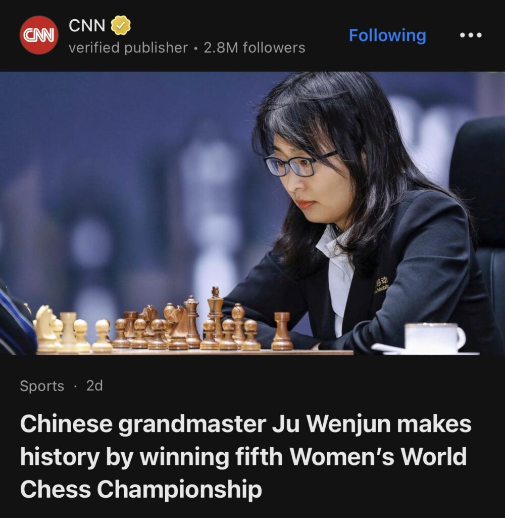 13。据CNN报道,中国特级大师居文君第五次夺得女子国际象棋世界锦标赛冠军,创造历史。