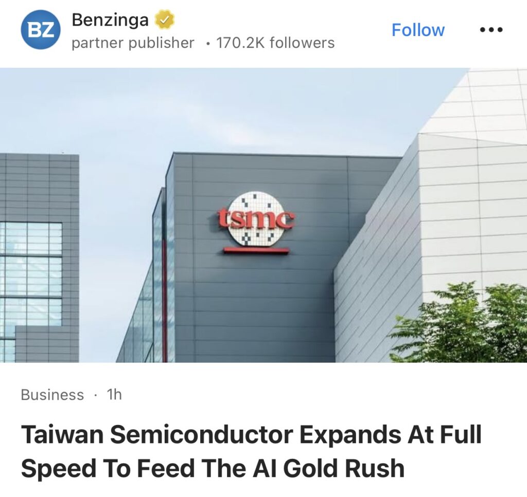 14。据Benzinga 周二报道,台积电全速扩产,助力AI淘金热。