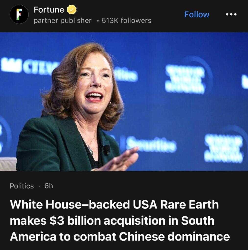 2。据Fortune 周一报道,获白宫支持的 USA Rare Earth 在南美洲斥资30亿美元进行收购,以抗衡中国的垄断地位。