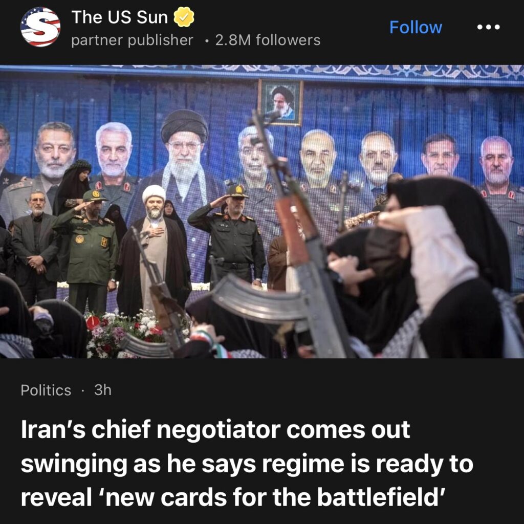 6。据The US Sun 周一报道,伊朗首席谈判代表强硬发声,宣称该政权已准备好亮出“战场上的新底牌”。