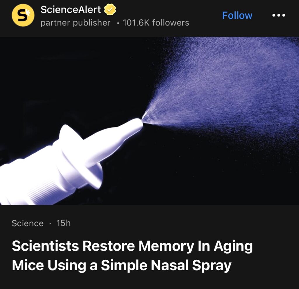 5。据ScienceAlert 周一报道,科学家利用一种简单的鼻喷剂恢复了老年小鼠的记忆。