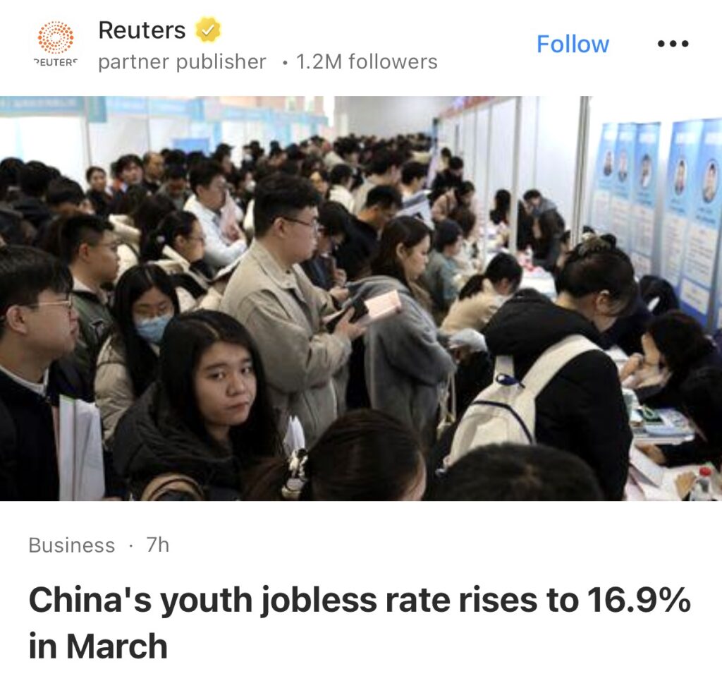 9。北京,4月21日(路透社)——国家统计局数据显示,3月份,中国城镇地区30岁以下人群(不含在校大学生)的失业率有所上升。• 在受访人群中最年轻的群体——即16至24岁的人群中,失业率从一个月前的16.1%升至16.9%,