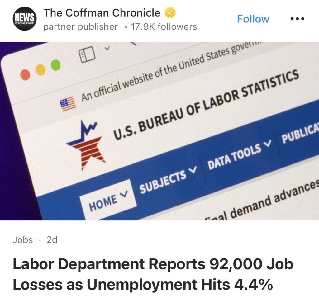11。据The Coffman Chronicle 周六报道,美国劳工部报告,二月份美国流失9.2万个就业岗位,失业率升至4.4%。