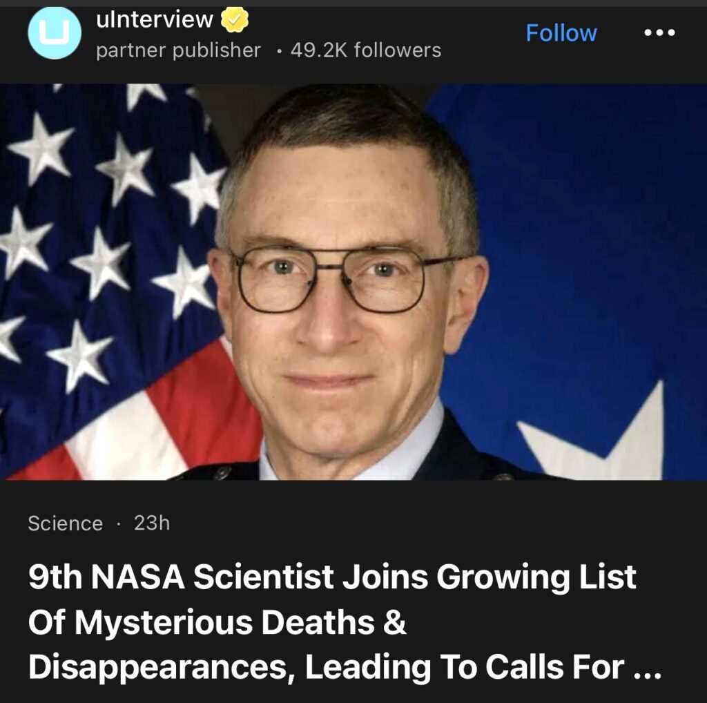 9。据uInterview 周二报道,第九位NASA科学家加入神秘死亡与失踪者日益增长的名单,引发要求展开调查的呼声。