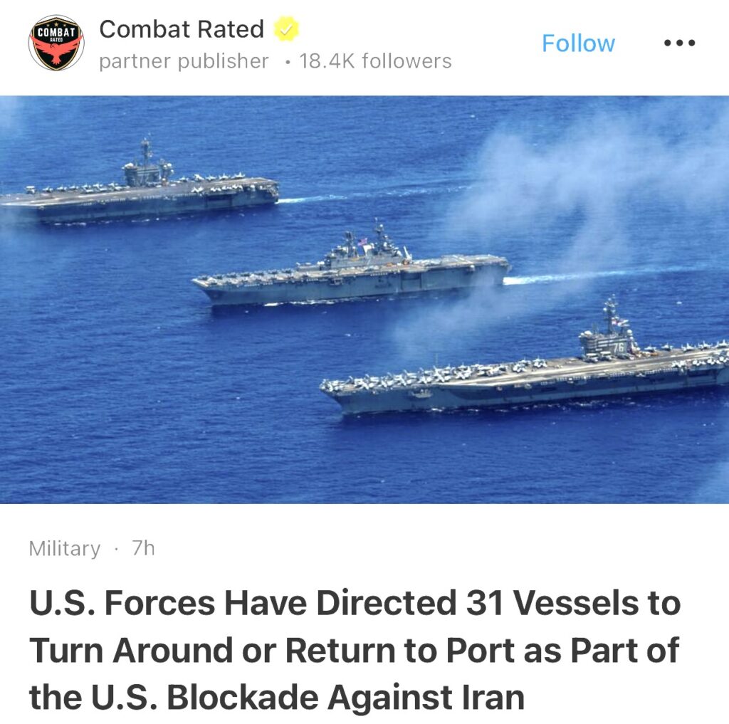11。据Combat Rated 周四报道,作为美国对伊朗实施封锁行动的一部分,美军已指令31艘船只掉头或返港。