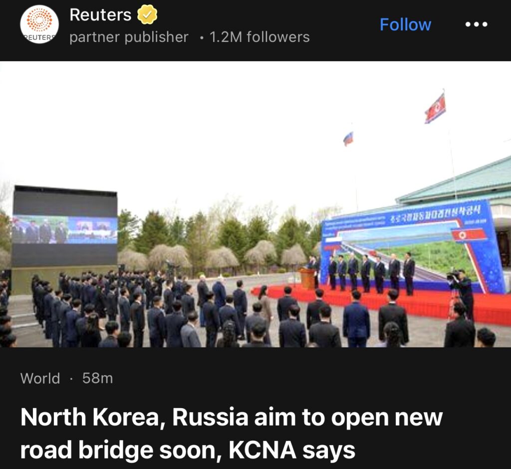 6。首尔,4月23日(路透社)——据朝鲜官方媒体朝中社周四报道,随着两国关系日益紧密,朝鲜与俄罗斯计划尽快开通一座横跨图们江、连接两国的公路桥。