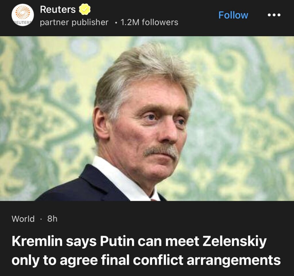 10。4月22日(路透社)——据俄罗斯新闻社周三援引克里姆林宫发言人德米特里·佩斯科夫的话报道,俄罗斯总统弗拉基米尔·普京只有在旨在敲定冲突相关协议的情况下,才会与乌克兰总统弗拉基米尔·泽连斯基举行会晤。