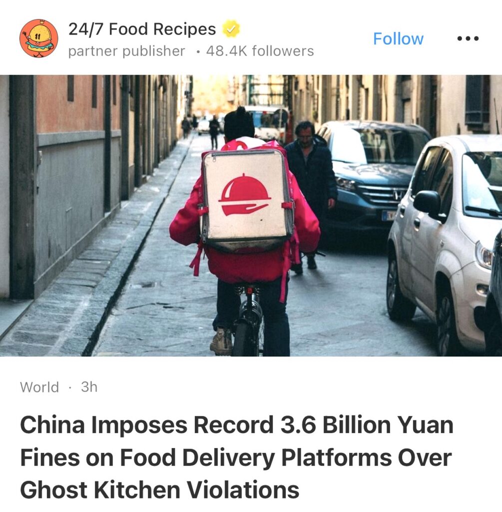 12。据24/7 Food Recipes 周四报道,中国因“幽灵厨房”违规行为,对外卖平台处以创纪录的36亿元罚款。