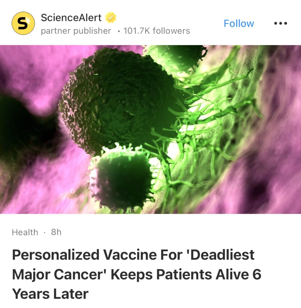 13。据ScienceAlert 周四报道,针对“最致命主要癌症”的个性化疫苗,让患者在6年后依然存活。这种药物目前仍处于临床试验阶段,但截至今年,研究人员表示,七名胰腺癌患者在接种疫苗后免疫系统产生了应答,目前均安然无恙。