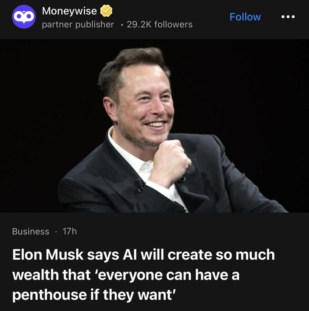 3。据Moneywise 周三报道,埃隆·马斯克表示,人工智能将创造海量财富,以至于“只要愿意,每个人都能拥有一套顶层豪华公寓”。