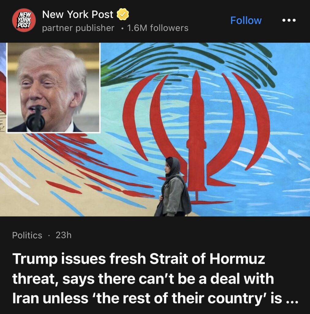 5。据New York Post 周二报道,特朗普就霍尔木兹海峡发出新的威胁,声称除非“把伊朗剩下的国土”炸毁,否则无法与伊朗达成协议。