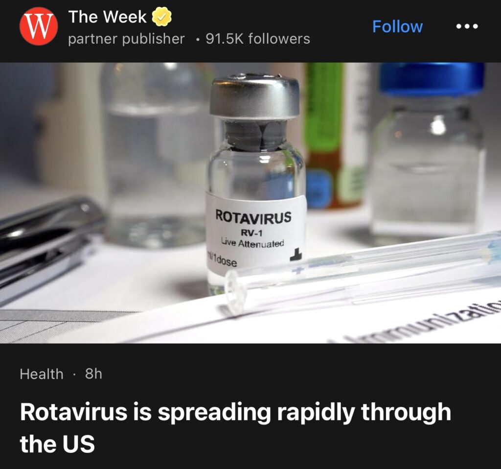 8。据The Week 周三报道,轮状病毒这种潜在致命的胃肠道病原体,正以惊人的速度在全美范围内传播。幼儿面临严重感染的风险最高。专家认为,疫苗接种率的下降是导致这一趋势的幕后原因。
