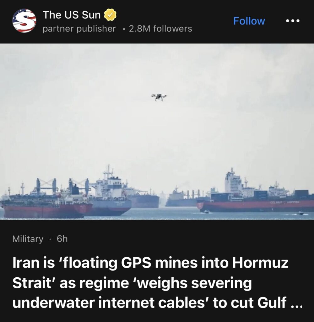 4。据The US Sun 周三报道,伊朗正向霍尔木兹海峡“投放GPS水雷”,与此同时,该政权正“权衡切断海底互联网光缆”以孤立海湾地区。