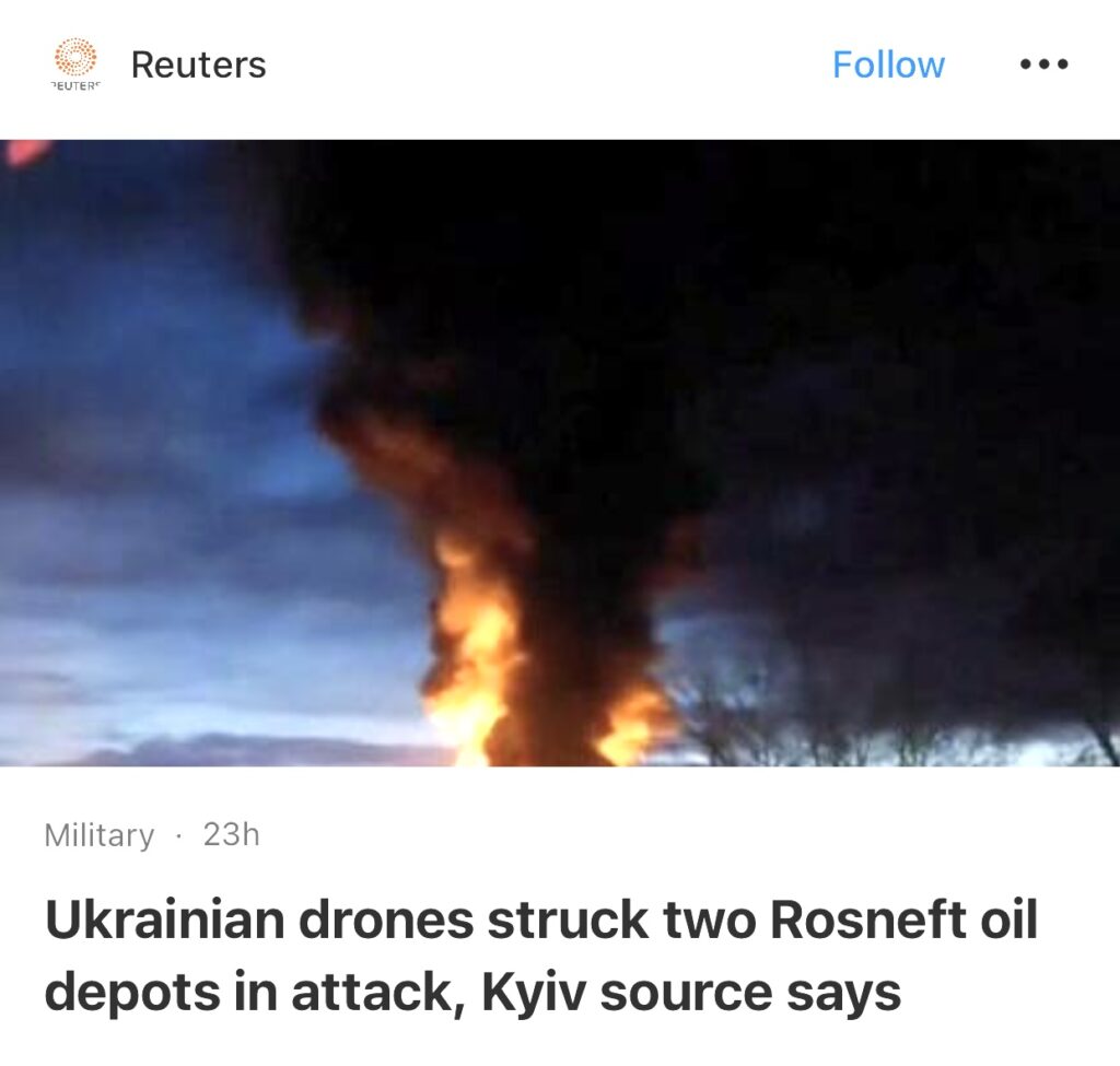 13。据Reuters报道,基辅消息人士称,乌克兰无人机袭击了俄罗斯石油公司的两个油库。”SBU继续有效地摧毁为乌克兰境内的俄罗斯军队提供燃料的军事基础设施和后勤设施。” “这些设施现在是、将来仍然是我们绝对合法的目标。”