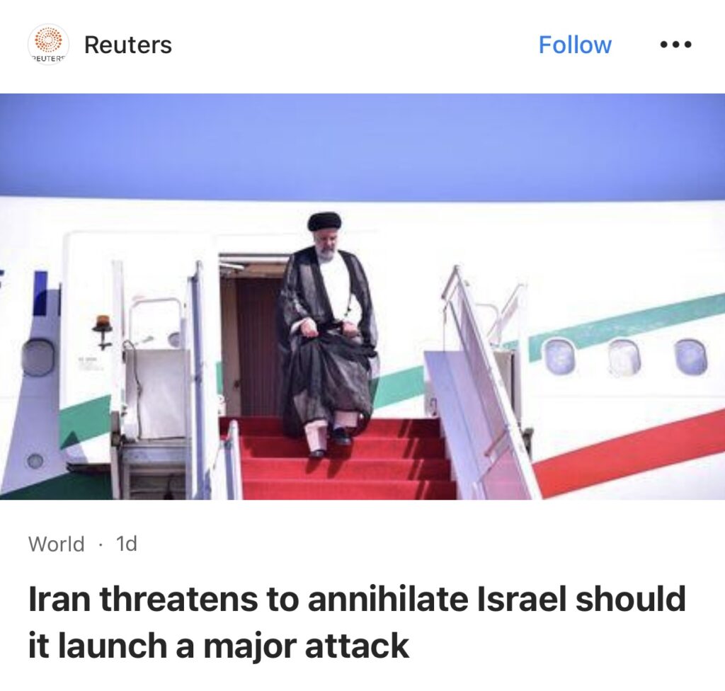 10。据迪拜路透社报道,伊朗官方通讯社援引伊朗总统易卜拉欣·莱西周二的话说,以色列对伊朗领土的袭击可能会从根本上改变局势,并导致“犹太复国主义政权”不复存在。
