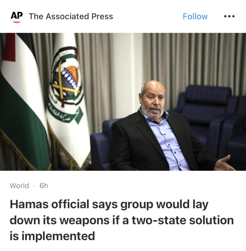 7。据伊斯坦布尔美联社报道,哈马斯一名高级政治官员告诉美联社,该伊斯兰激进组织愿意与以色列达成五年或更长时间的休战。如果巴勒斯坦独立,哈马斯将放下武器并转变为一个政党。