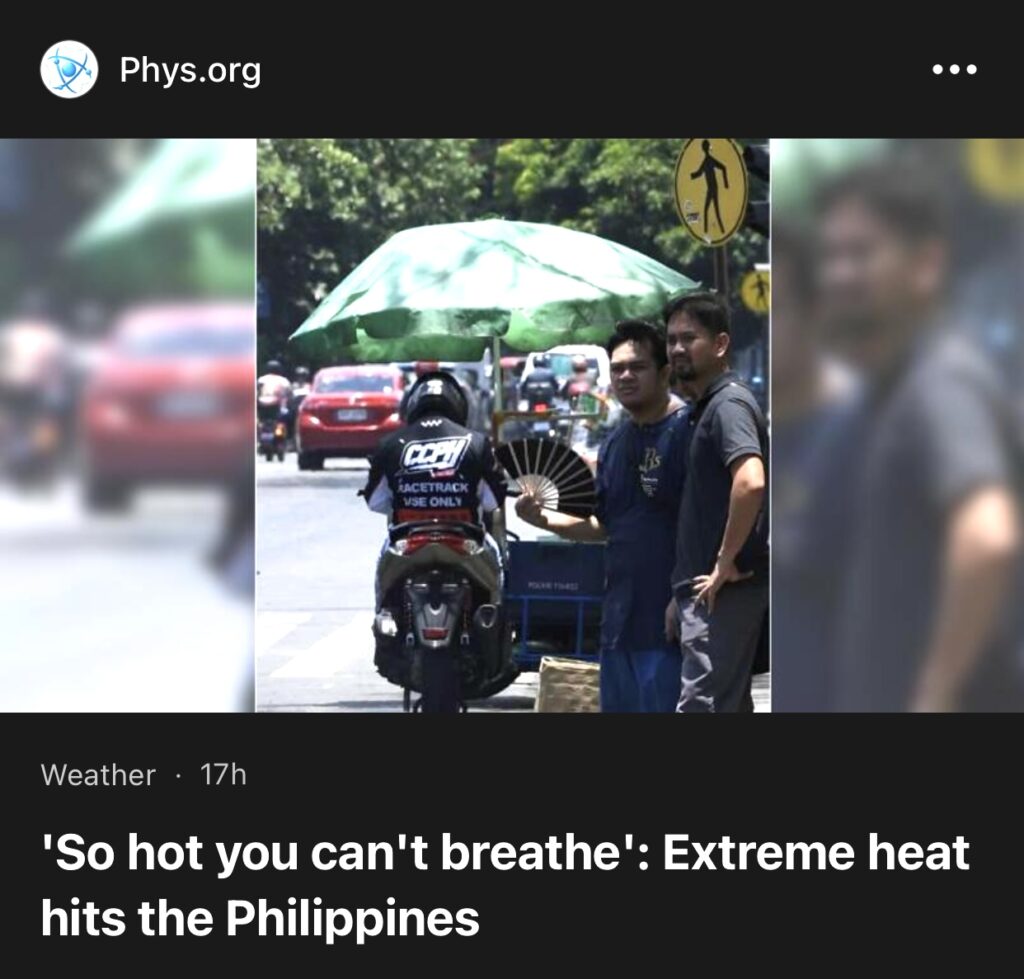 1。据Phy.org 报道,菲律宾遭遇酷热,人们称 “热得喘不过气来”。周三,菲律宾遭遇酷热,迫使学校暂停面授课程,政府并警告人们限制户外活动时间。