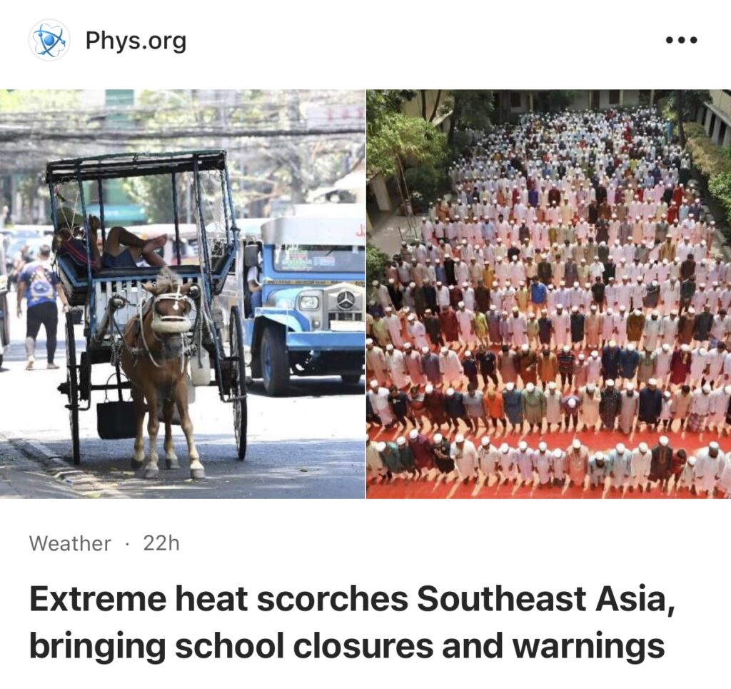 15。据Pys.org 报道,周三,极端高温烧焦了南亚和东南亚部分地区,导致菲律宾各地的学校停课,泰国首都发布高温警告,孟加拉国的信徒祈雨。
