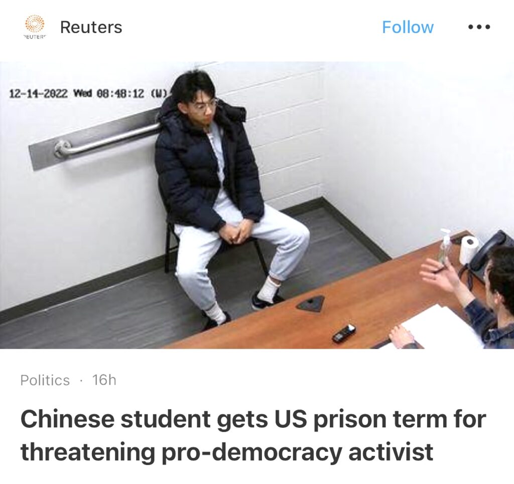 9。据波士顿路透社报道,周三,一名中国音乐系学生,在美国被判处九个月监禁,之后将被驱除出境。罪名是骚扰一名在波士顿伯克利音乐学院张贴支持中国民主传单的活动人士,并威胁要向中国执法部门举报她的活动。