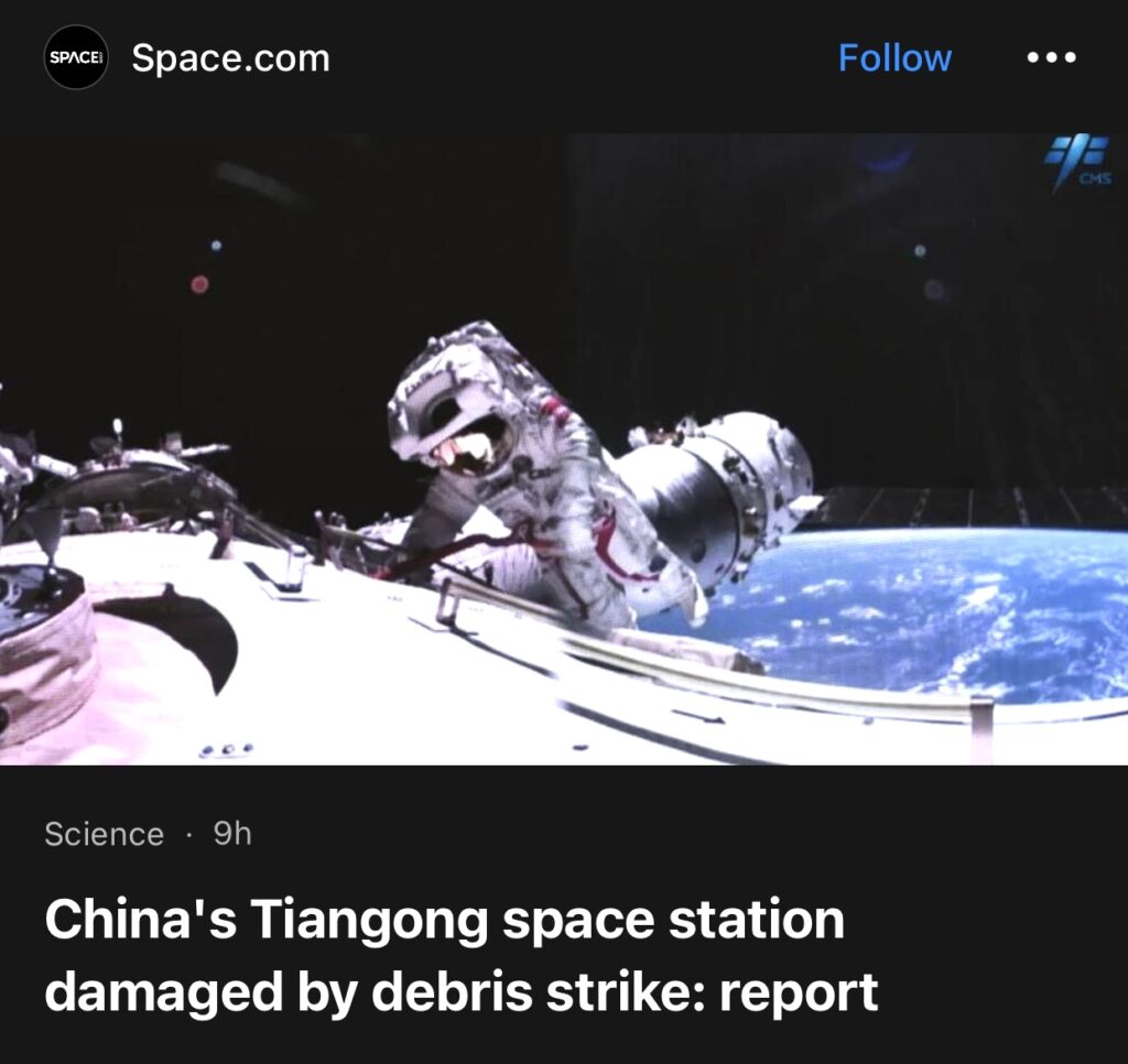 2。据中国官方媒体报道,在天宫空间站部分断电后,中国将加强对宇航空间碎片的处理。中国媒体称,在天宫空间站的太阳能电池板遭受碎片袭击而损坏后,出现了部分电力供应中断。