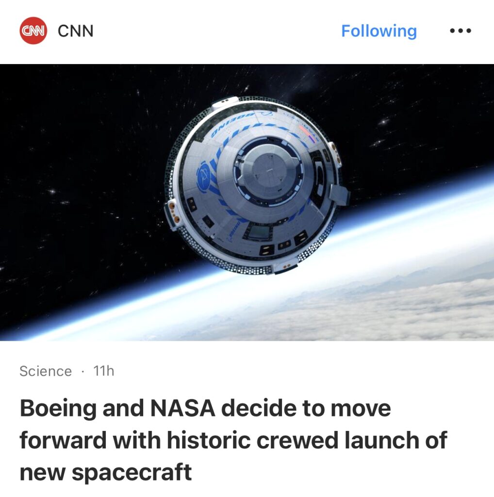 10。据CNN 报道,波音公司和美国宇航局决定推进新航天器的历史性载人发射。经过多年的延误和试飞期间一系列令人眼花缭乱的挫折后,波音公司的Starliner 航天器终于准备进行首次载人发射。