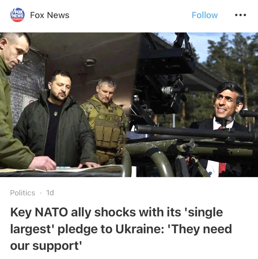 1。据Fox News报道,北约主要盟友对乌克兰做出的“最大的”承诺令人震惊:“他们需要我们的支持”。据英国广播公司 报道,苏纳克承诺向乌克兰再提供 5 亿英镑(6.2 亿美元)的资金,这进一步巩固了本财政年度已经拨款 25 亿英镑(31 亿美元)的数额。