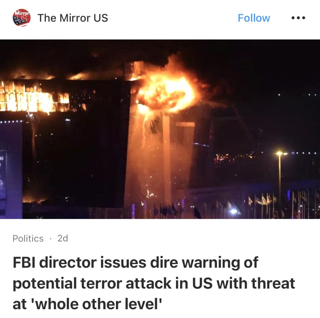 9。据The Mirror US报道,联邦调查局局长对美国可能发生的恐怖袭击发出可怕警告,称威胁达到“另一个级别”。美国联邦调查局“越来越担心”以色列与哈马斯战争期间针对美国的“协同恐怖袭击”,并警告说,潜在的袭击可能会类似于造成 144 人死亡的俄罗斯音乐厅大屠杀。