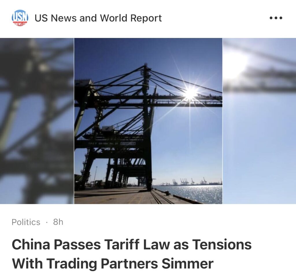 4。据北京路透社报道,中国周五通过了一项法律。如果外国对中国出口征收关税,比如华盛顿和布鲁塞尔就工业产能过剩问题瞄准北京,中国无疑可以反击。该法律将于 12 月 1 日生效,其概述了一系列与中国进出口关税相关的法律条款,从税收优惠的构成到中国对违反贸易协定的国家进行反击的权利。