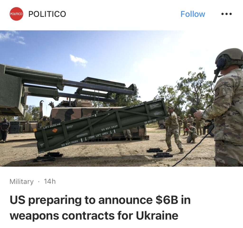 8。据POLITICO报道,两名美国官员透露,美国正在对迄今为止最大的乌克兰军事援助计划之一,进行最后的收尾工作,准备为基辅军队签署价值高达 60 亿美元的武器和装备合同。
