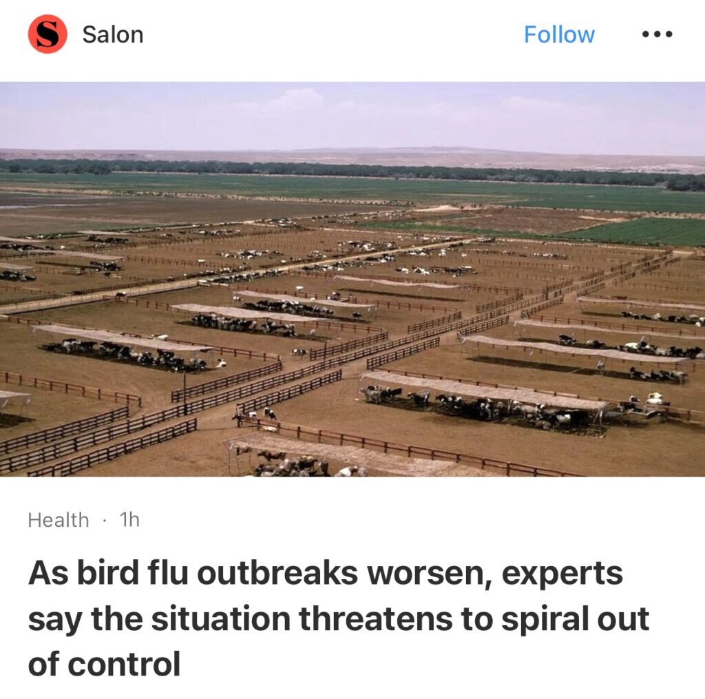 13。据Salon报道,专家表示,随着禽流感疫情恶化,情况可能会失控。传染病专家警告说,这些阳性检测表明疫情比之前想象的要严重得多。据美国农业部动植物卫生检验局 (APHIS) 称,已在 8 个州的 33 个牛群中发现了 H5N1 病毒。周四,FDA 一位高级官员表示,五分之一的牛奶样本 H5N1 检测呈阳性。