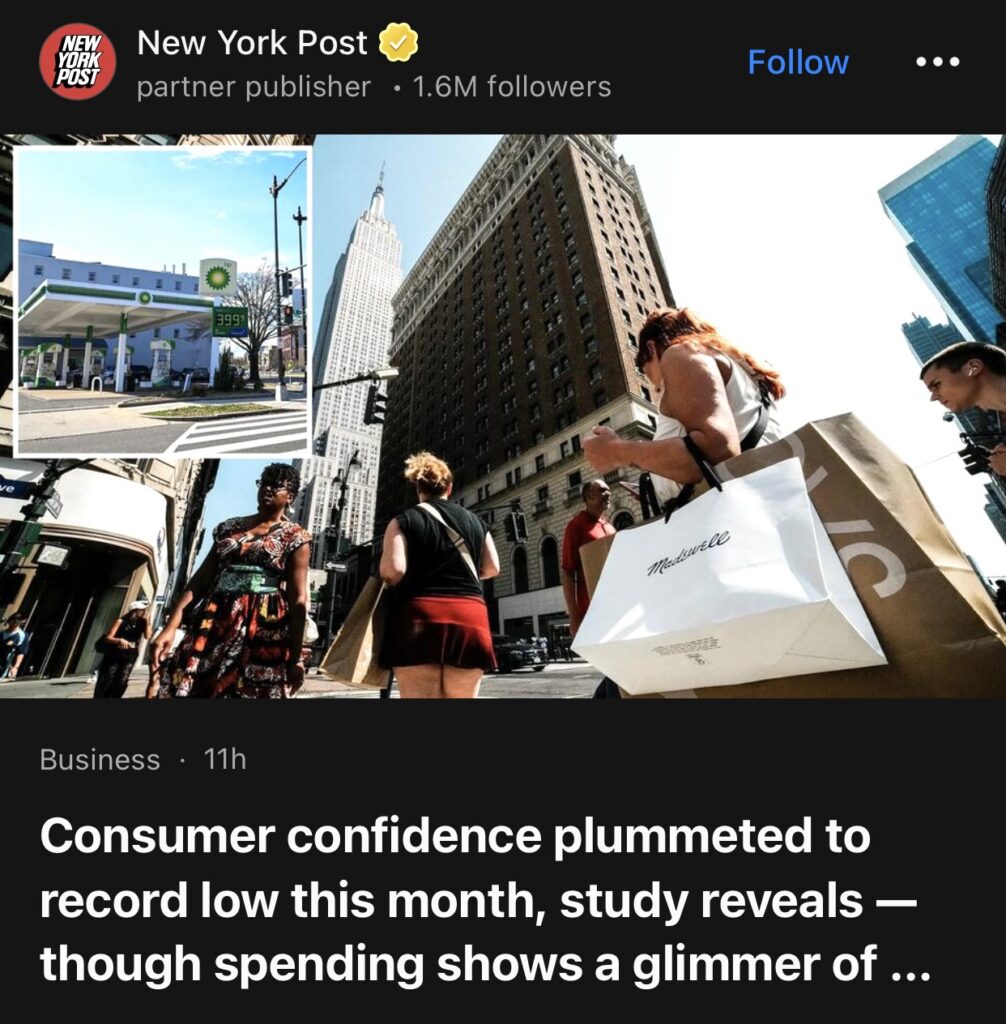 5。据New York Post 周六报道,一项研究显示,本月美国消费者信心暴跌至创纪录低点——尽管支出方面显露出一线希望。