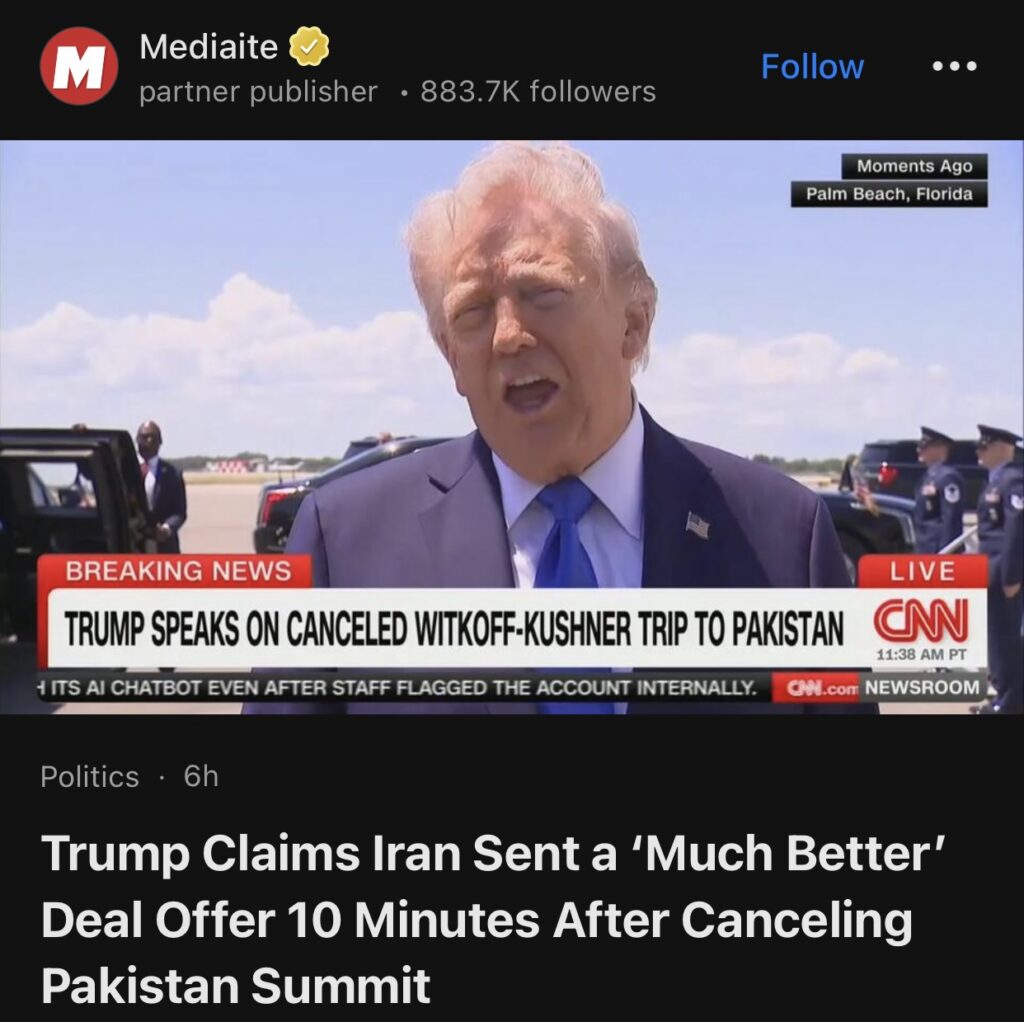 3。据Mediaite 周六报道,特朗普声称,伊朗在取消巴基斯坦峰会10分钟后,发来了一份“好得多”的协议提议。
