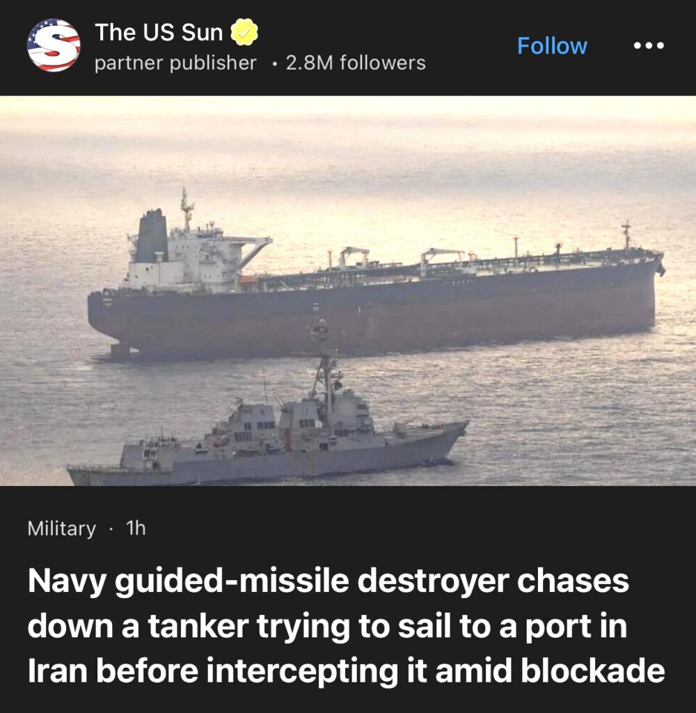 7。据The US Sun 周六 报道,一艘海军导弹驱逐舰在封锁期间,追击并拦截了一艘正试图驶往伊朗港口的油轮。