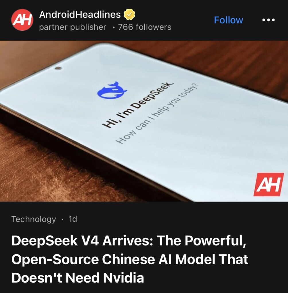 9。据AndroidHeadlines 周五报道,DeepSeek V4 重磅登场:无需英伟达的强大开源中文 AI 模型。