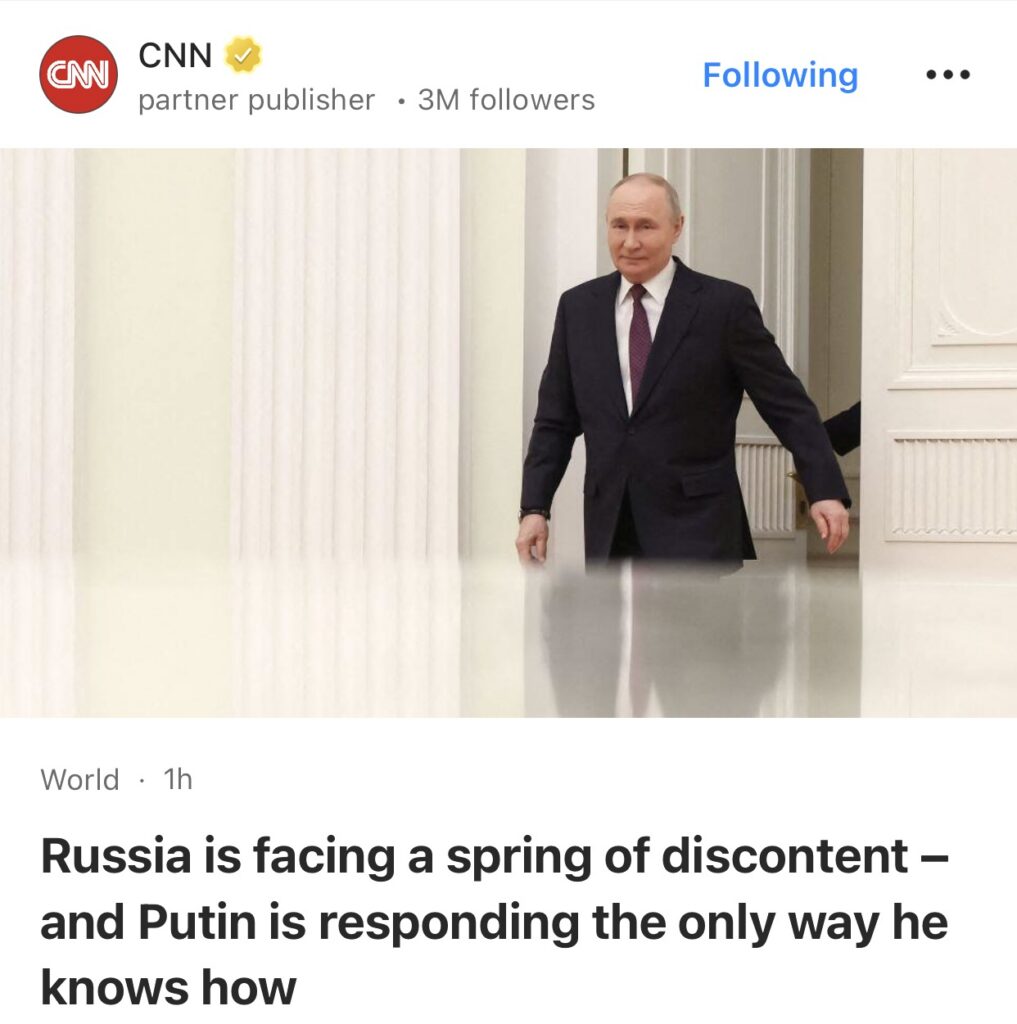 13。据CNN 周日报道,在全面入侵乌克兰四年之后,俄罗斯正面临一个“不满之春”。俄罗斯各大城市接连发生的网络中断现象触动了普通民众的敏感神经,针对俄罗斯总统弗拉基米尔·普京的公众抵触情绪正日益显现。